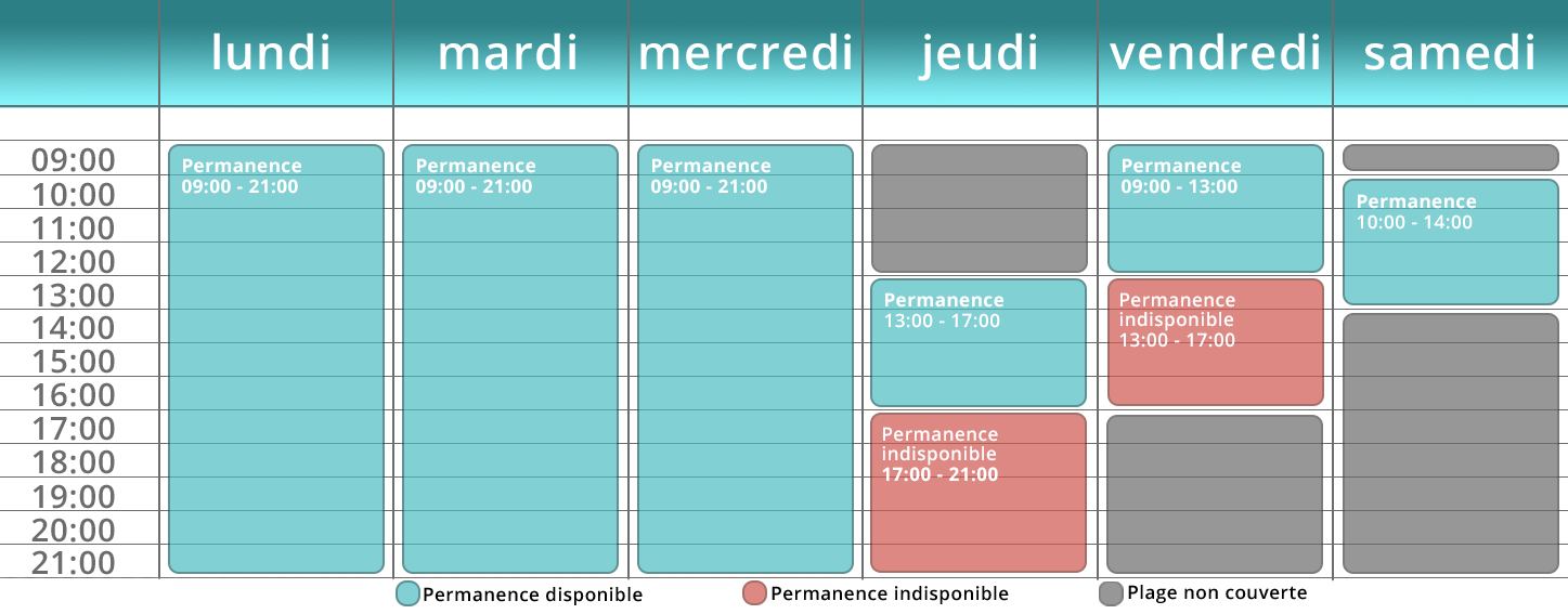 Notre équipe fait tout son possible pour vous répondre aux horaires indiqués. Il peut cependant arriver que le service soit indisponible.